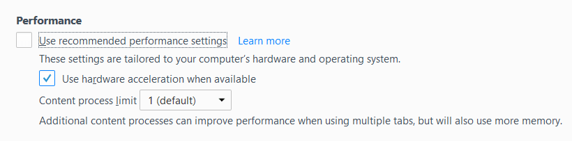 In Firefox 55, Mozilla has introduced a new performance section in Settings, which lets you control number of running content processes. The more the content processes, the better the Firefox performance with multiple tabs, but more memory will be consumed. So you should leave those settings enabled unless you’re an advanced user having a lot of RAM and you know what you’re doing.
